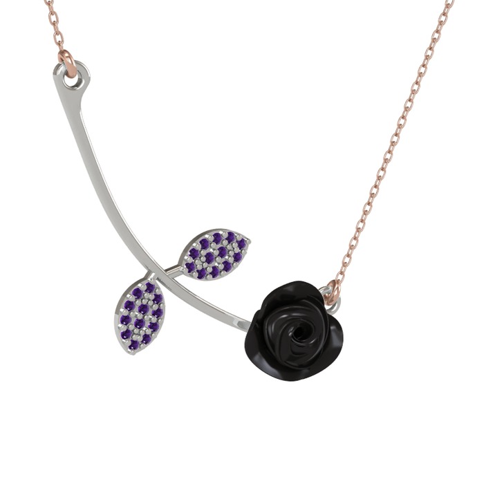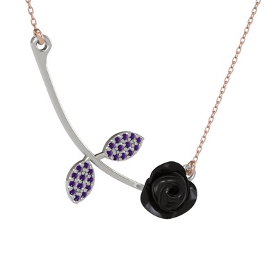 Ametist 925 ayar gümüş kolye (Siyah mineli, 40 cm rose altın rolo zincir)