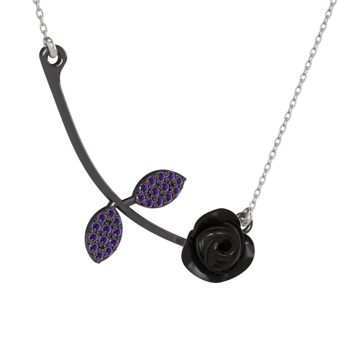 Ametist 925 ayar siyah rodyum kaplama gümüş kolye (Siyah mineli, 40 cm beyaz altın rolo zincir)