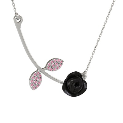 Pembe kuvars 8 ayar beyaz altın kolye (Siyah mineli, 40 cm beyaz altın rolo zincir)