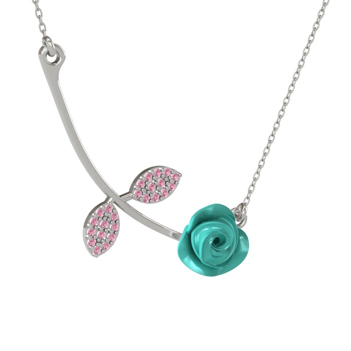 Pembe kuvars 8 ayar beyaz altın kolye (Turkuaz mineli, 40 cm beyaz altın rolo zincir)