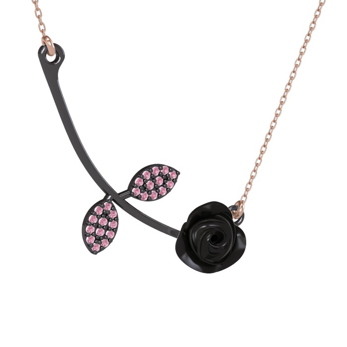 Pembe kuvars 925 ayar siyah rodyum kaplama gümüş kolye (Siyah mineli, 40 cm gümüş rolo zincir)