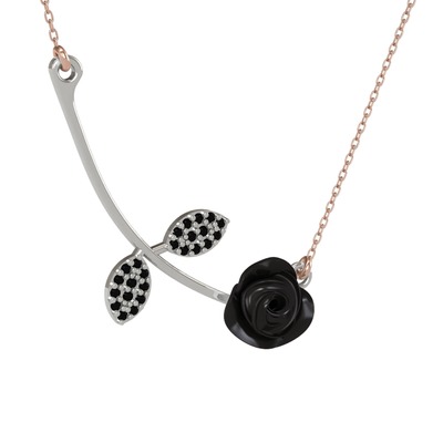 Siyah zirkon 8 ayar beyaz altın kolye (Siyah mineli, 40 cm rose altın rolo zincir)
