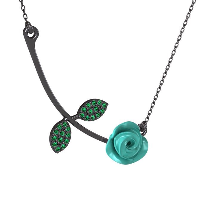 Yeşil kuvars 925 ayar siyah rodyum kaplama gümüş kolye (Turkuaz mineli, 40 cm gümüş rolo zincir)