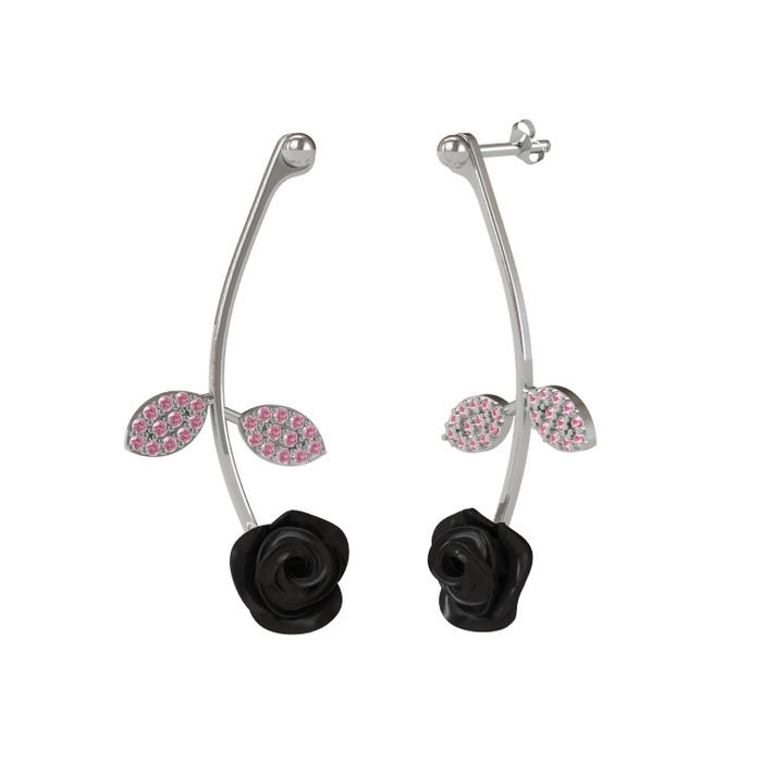 Pembe kuvars 8 ayar beyaz altın küpe (Siyah mineli)