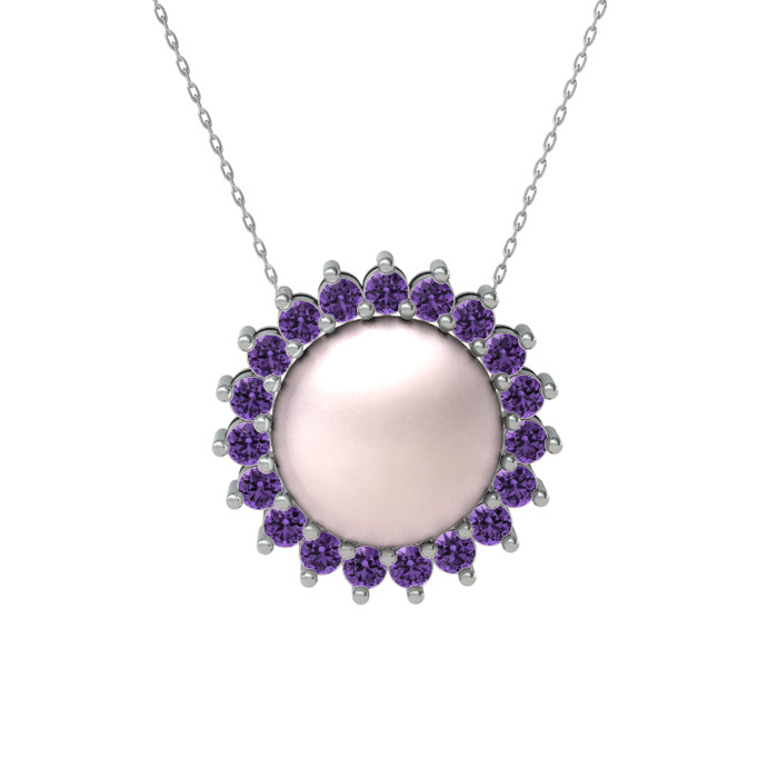 Pembe inci ve ametist 14 ayar beyaz altın kolye (40 cm beyaz altın rolo zincir)