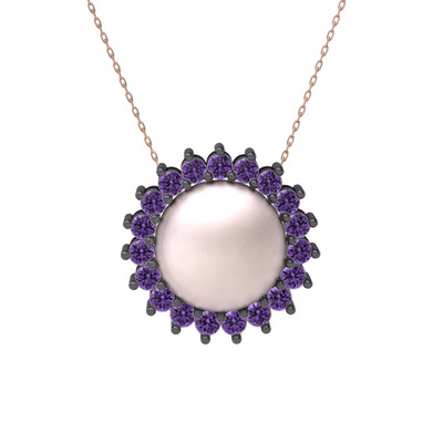 Pembe inci ve ametist 925 ayar siyah rodyum kaplama gümüş kolye (40 cm rose altın rolo zincir)