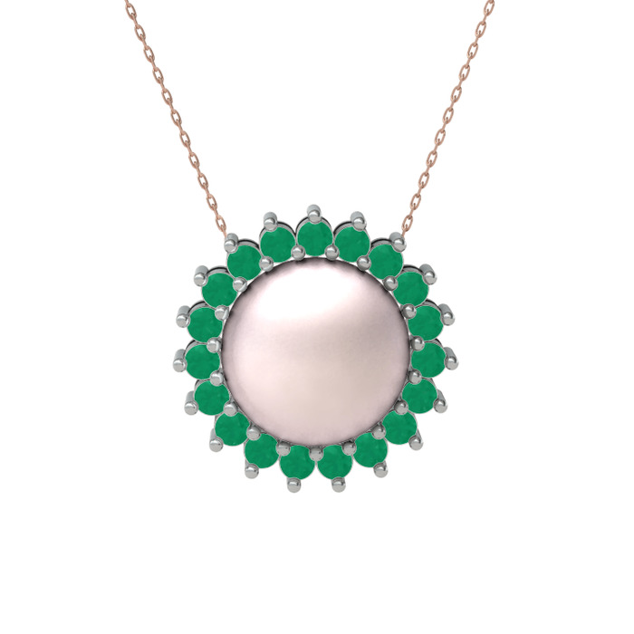Pembe inci ve kök zümrüt 18 ayar beyaz altın kolye (40 cm rose altın rolo zincir)