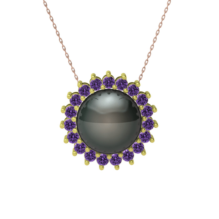 Siyah inci ve ametist 14 ayar altın kolye (40 cm rose altın rolo zincir)