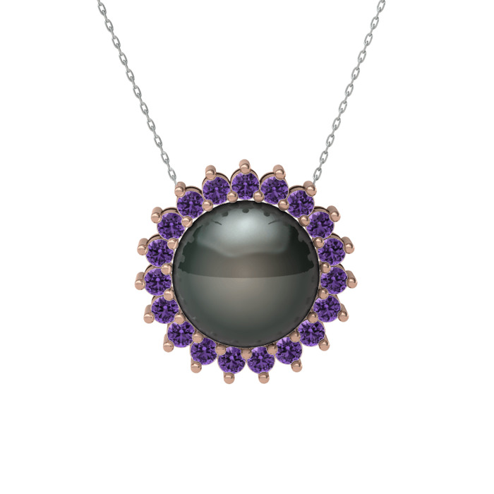 Siyah inci ve ametist 925 ayar rose altın kaplama gümüş kolye (40 cm gümüş rolo zincir)