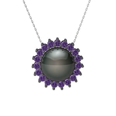 Siyah inci ve ametist 925 ayar siyah rodyum kaplama gümüş kolye (40 cm beyaz altın rolo zincir)