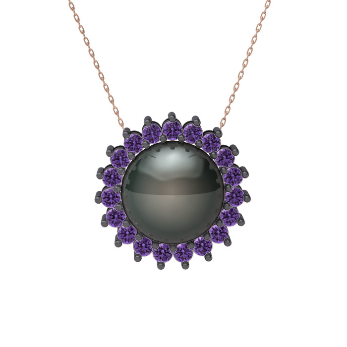 Siyah inci ve ametist 925 ayar siyah rodyum kaplama gümüş kolye (40 cm rose altın rolo zincir)