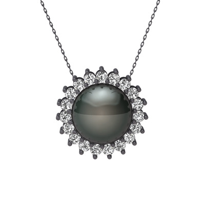 Siyah inci ve beyaz zirkon 925 ayar siyah rodyum kaplama gümüş kolye (40 cm gümüş rolo zincir)