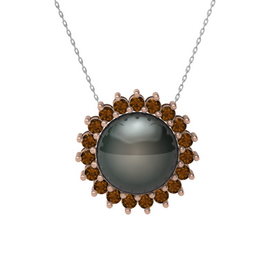 Siyah inci ve dumanlı kuvars 14 ayar rose altın kolye (40 cm beyaz altın rolo zincir)