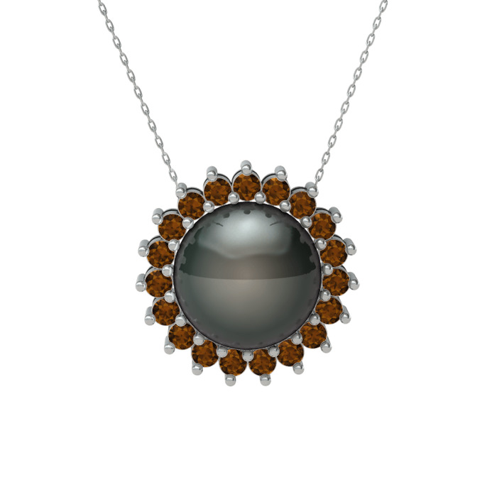Siyah inci ve dumanlı kuvars 18 ayar beyaz altın kolye (40 cm beyaz altın rolo zincir)