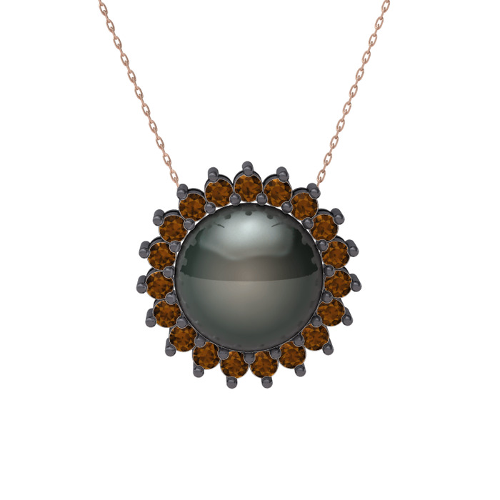 Siyah inci ve dumanlı kuvars 925 ayar siyah rodyum kaplama gümüş kolye (40 cm rose altın rolo zincir)