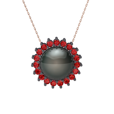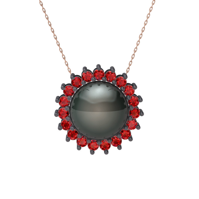 Siyah inci ve garnet 925 ayar siyah rodyum kaplama gümüş kolye (40 cm rose altın rolo zincir)