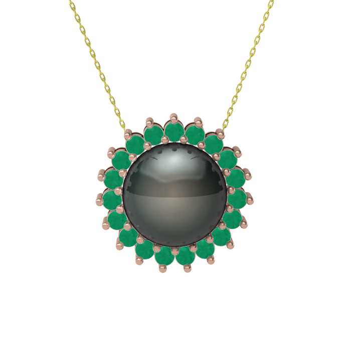 Siyah inci ve kök zümrüt 18 ayar rose altın kolye (40 cm altın rolo zincir)
