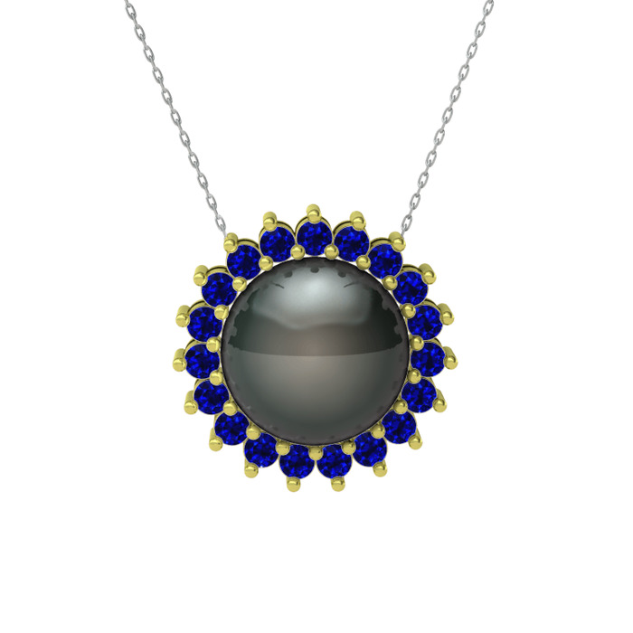 Siyah inci ve lab safir 14 ayar altın kolye (40 cm beyaz altın rolo zincir)