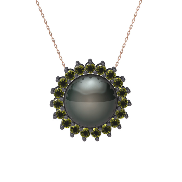 Siyah inci ve peridot 925 ayar siyah rodyum kaplama gümüş kolye (40 cm gümüş rolo zincir)