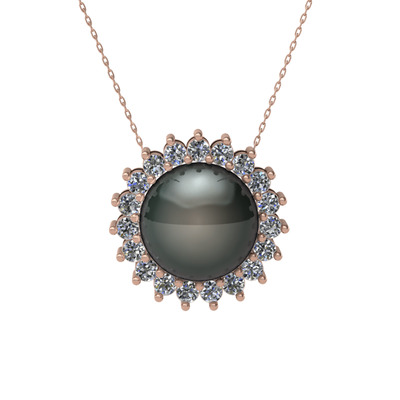 Siyah inci ve pırlanta 8 ayar rose altın kolye (0.285 karat, 40 cm gümüş rolo zincir)