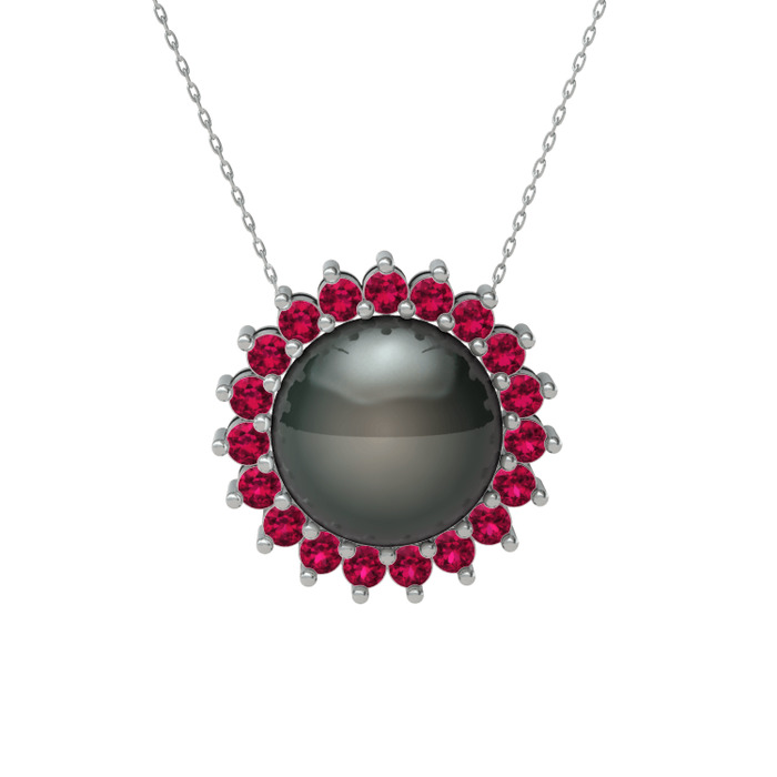 Siyah inci ve rodolit garnet 14 ayar beyaz altın kolye (40 cm beyaz altın rolo zincir)