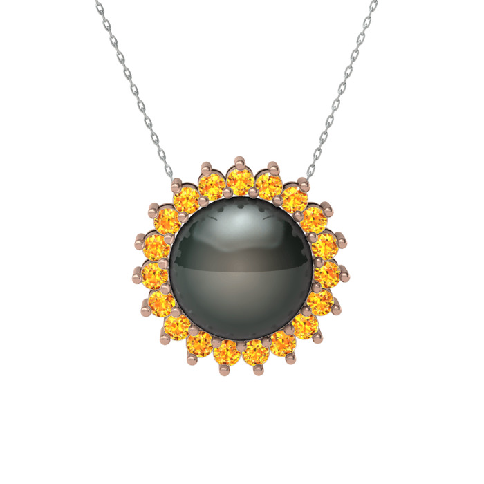 Siyah inci ve sitrin 14 ayar rose altın kolye (40 cm beyaz altın rolo zincir)