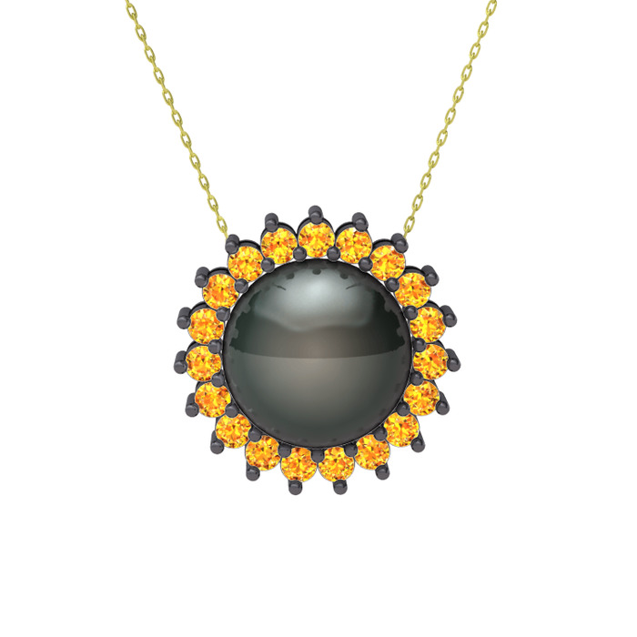 Siyah inci ve sitrin 925 ayar siyah rodyum kaplama gümüş kolye (40 cm altın rolo zincir)
