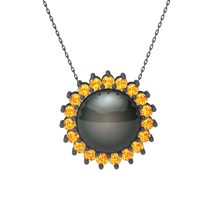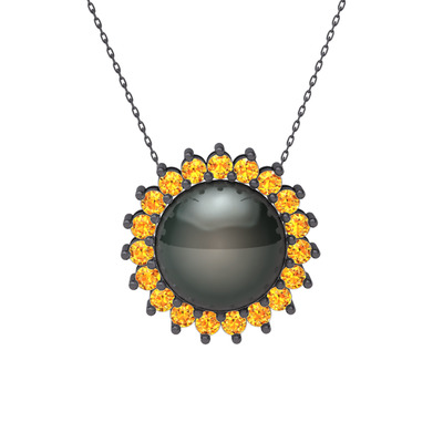Siyah inci ve sitrin 925 ayar siyah rodyum kaplama gümüş kolye (40 cm gümüş rolo zincir)