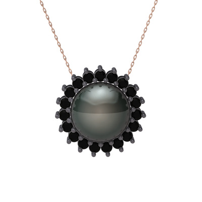 Siyah inci ve siyah zirkon 925 ayar siyah rodyum kaplama gümüş kolye (40 cm rose altın rolo zincir)