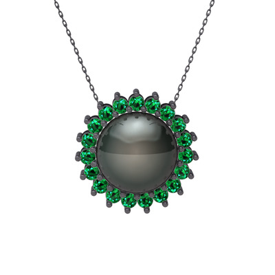Siyah inci ve yeşil kuvars 925 ayar siyah rodyum kaplama gümüş kolye (40 cm gümüş rolo zincir)