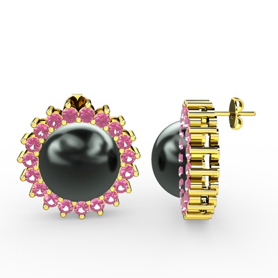 Siyah inci ve pembe kuvars 18 ayar altın küpe