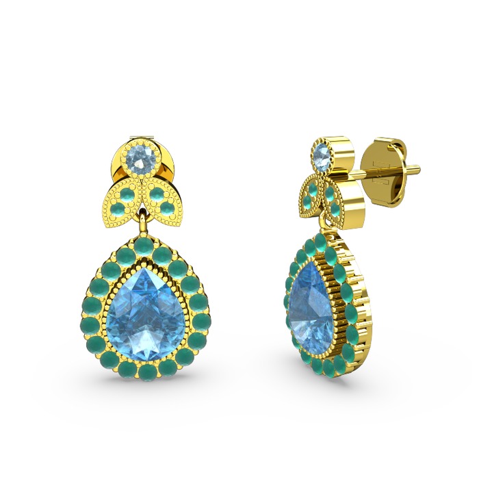 Akuamarin ve kök zümrüt 8 ayar altın küpe