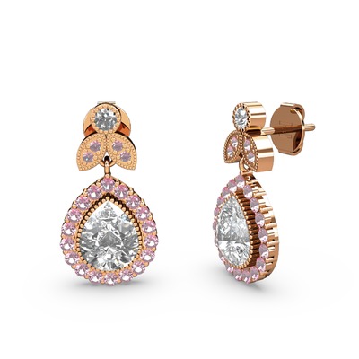 Beyaz zirkon ve pembe kuvars 18 ayar rose altın küpe