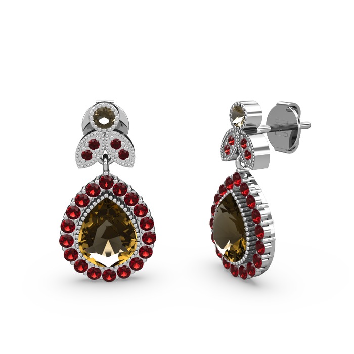 Dumanlı kuvars ve garnet 18 ayar beyaz altın küpe