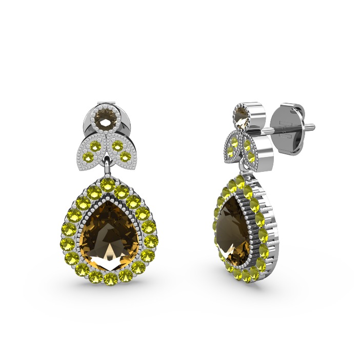 Dumanlı kuvars ve peridot 14 ayar beyaz altın küpe