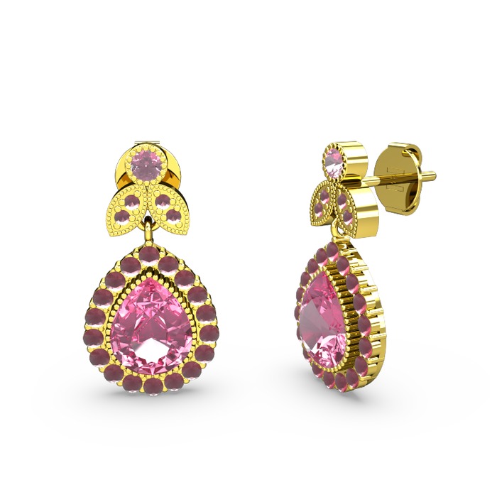 Pembe kuvars ve kök yakut 8 ayar altın küpe