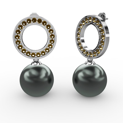 Siyah inci ve dumanlı kuvars 8 ayar beyaz altın küpe