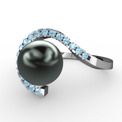 Siyah inci ve akuamarin 14 ayar beyaz altın yüzük