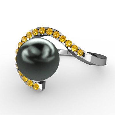 Siyah inci ve sitrin 18 ayar beyaz altın yüzük