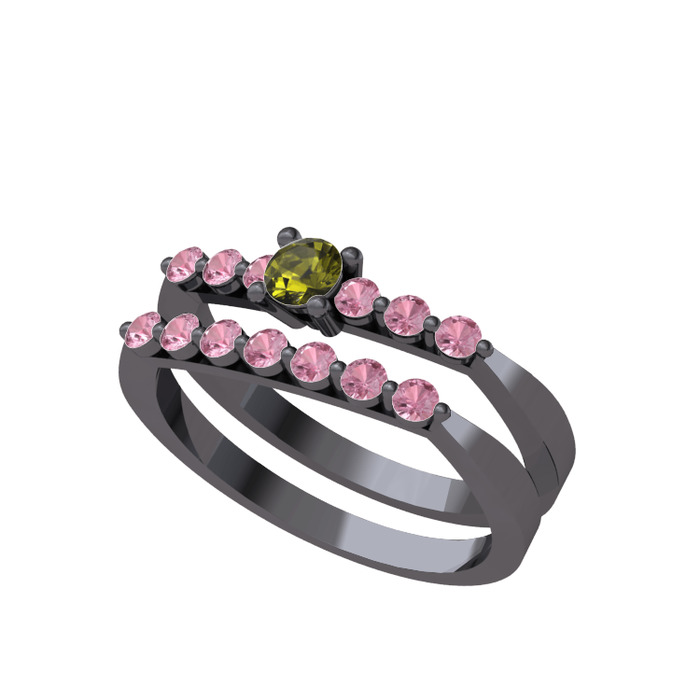 Peridot ve pembe kuvars 925 ayar siyah rodyum kaplama gümüş yüzük