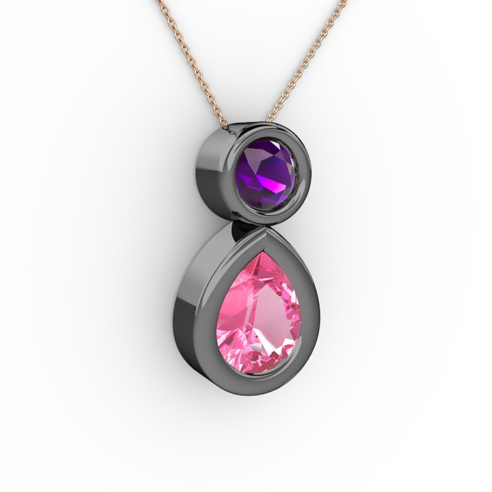 Pembe kuvars ve ametist 925 ayar siyah rodyum kaplama gümüş kolye (40 cm rose altın rolo zincir)