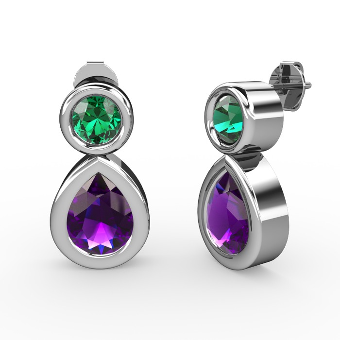 Ametist ve yeşil kuvars 8 ayar beyaz altın küpe