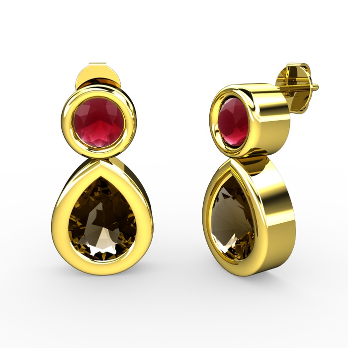 Dumanlı kuvars ve kök yakut 18 ayar altın küpe