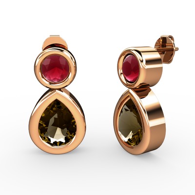 Dumanlı kuvars ve kök yakut 8 ayar rose altın küpe