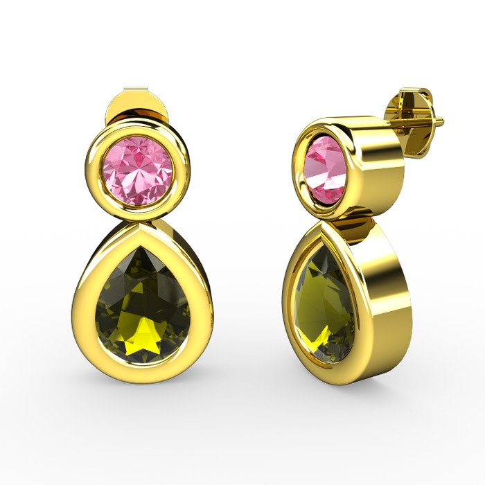 Peridot ve pembe kuvars 14 ayar altın küpe