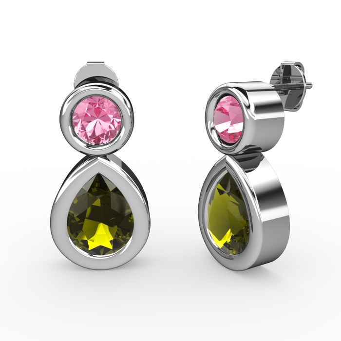 Peridot ve pembe kuvars 8 ayar beyaz altın küpe