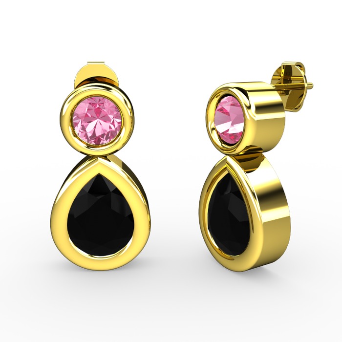 Siyah zirkon ve pembe kuvars 18 ayar altın küpe