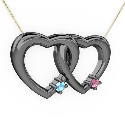 Akuamarin ve pembe kuvars 925 ayar siyah rodyum kaplama gümüş kolye (40 cm altın rolo zincir)