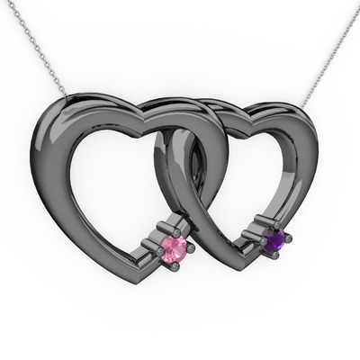 Pembe kuvars ve ametist 925 ayar siyah rodyum kaplama gümüş kolye (40 cm beyaz altın rolo zincir)