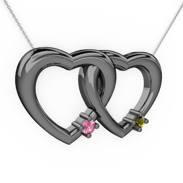 Pembe kuvars ve peridot 925 ayar siyah rodyum kaplama gümüş kolye (40 cm beyaz altın rolo zincir)